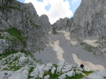 Spust po isti poti - delno melišÄa z debelim kamenjem, delno snežišÄa |
