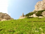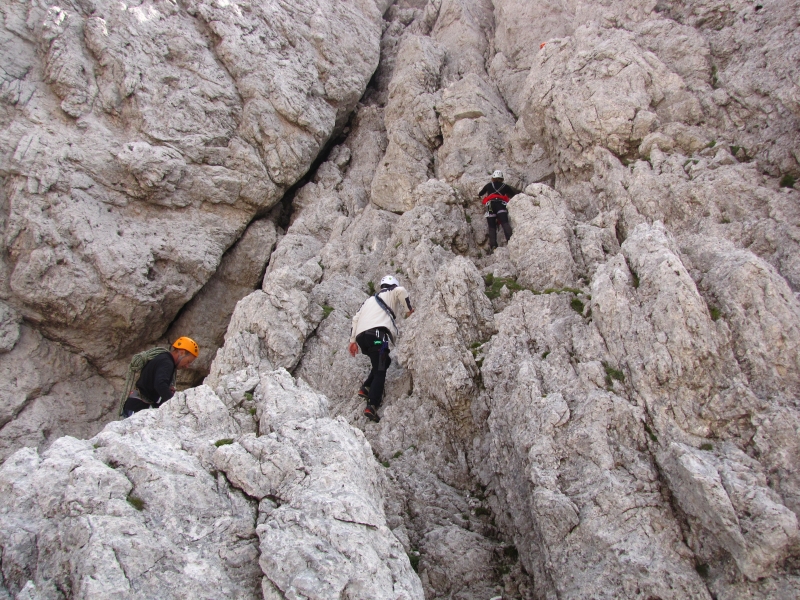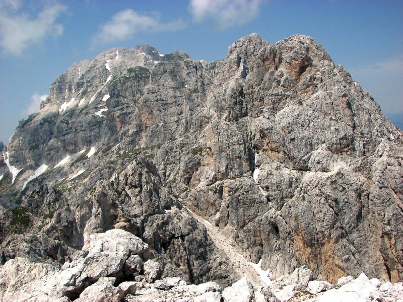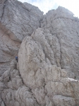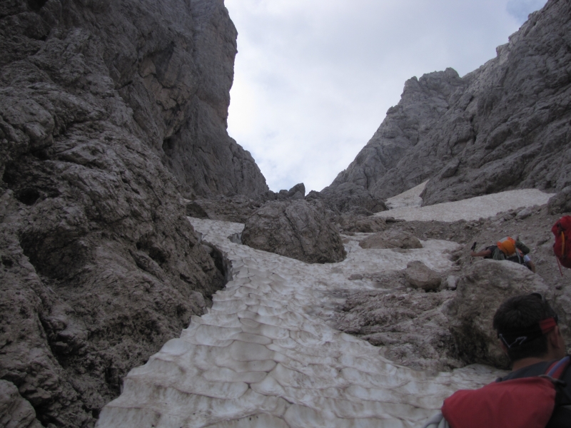 Ko bomo po zagruščeni polici dosegli Krniško škrbino bo verjetno že čas za slovo. Najvišja gora nad Belim potokom je sicer blizu, a zdi se mi, da bi bilo to vendarle preveč za, že tako doživljajev poln, gorniški dan. V dolino se lahko vrnemo po »naši« dolini mimo bivaka ali pa sestopimo na drugo stran do koče Corsi in naprej po prečni poti čez jugozahodna pobočja Visoke Bele špice in preko grap, ki se spuščajo izpod nje in sosednjih špic. V dolino bomo prišli sicer po drugi poti (po tisti, ki sem jo opisal pri Višu), a skoraj na jutranjem izhodišču, zato hoje po cesti ne bo več kot nekaj korakov. |